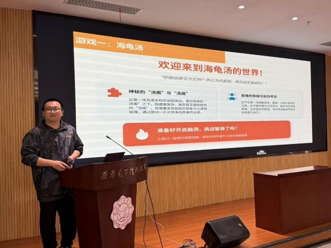 热身游戏“数字炸弹”迅速点燃现场热情,不慎“触雷”的同学落落大方地分享暖心趣事或表达诚挚谢意,拘谨在笑声中悄然消融。随后的团队竞技环节高潮迭起:“海龟汤推理挑战赛”中,四支队伍围绕谜题抽丝剥茧、缜密推理;“百变数字接力赛”创意十足,队员们默契接力、相互鼓励;“你比划我猜”更是欢乐不断,生动的肢体语言与迅捷的猜词反应赢得满堂喝彩。