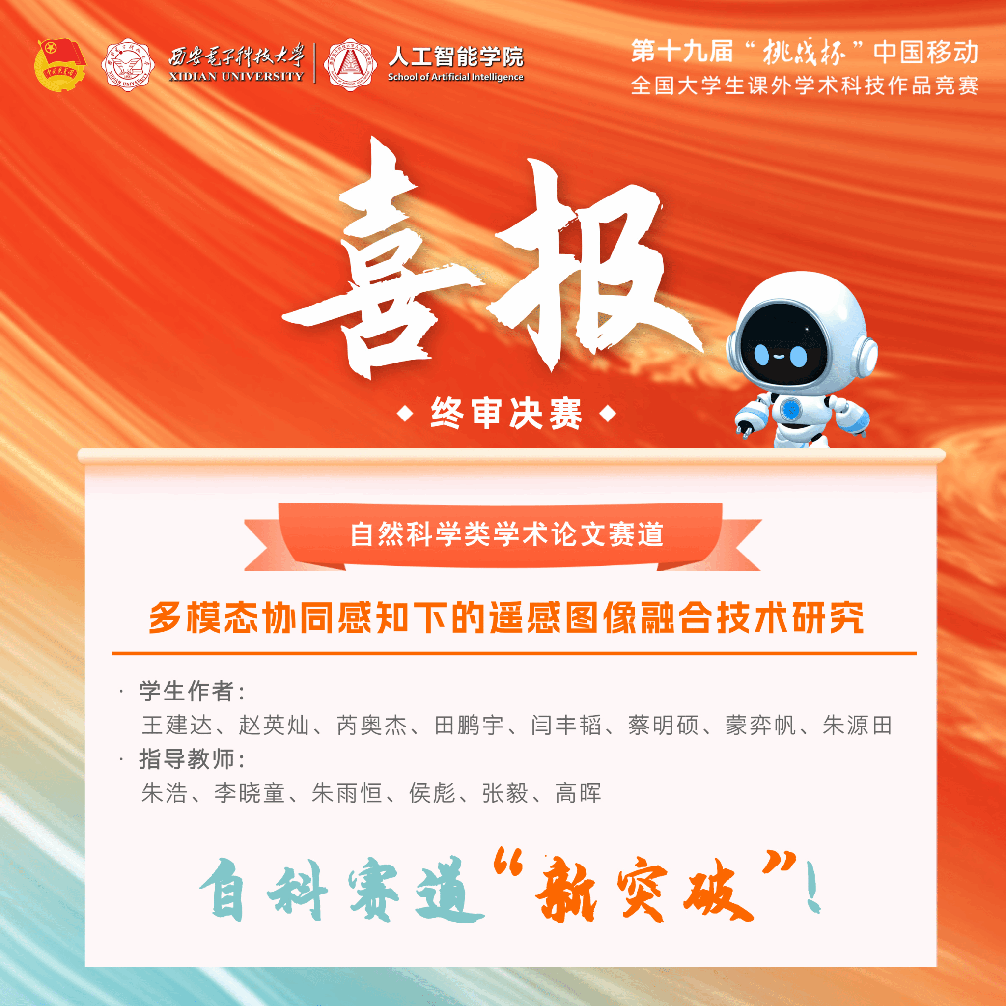 (通讯员:朱雨恒、李 雯、胡锦国) 11月3日,第十九届“挑战杯”全国大学生课外学术科技作品竞赛终审决赛在南京大学落下帷幕。我院学子积极备赛、奋发进取,项目《多模态协同感知下的遥感图像融合技术研究》获自然科学类学术论文赛道全国三等奖。同时,该项目在省赛中荣获特等奖。这是我校在赛事主体赛“自然科学类学术论文赛道”中首次获得国家级奖项和省级特等奖,取得了在该赛道中的“新突破”!